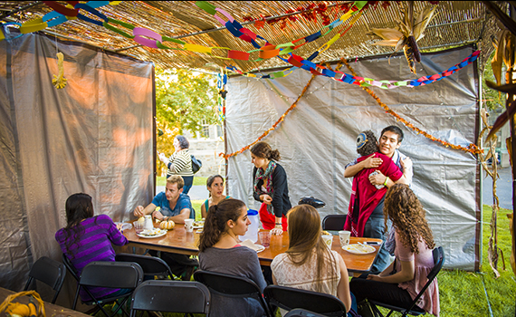Sukkot, an Hebrew word meaning “booths” or “huts,” refers to the Jewish festival of giving thanks for the fall harvest. It also commemorates the 40 years of wandering in the desert after the giving of the Torah at Mount Sinai. Sukkot is observed by several distinct traditions. One, which takes the commandment to dwell in booths literally, is to erect a sukkah, a small, temporary booth or hut. Sukkot (in this case, the plural of sukkah) are commonly used during the seven-day festival for eating, entertaining, and even for sleeping. Sukkot is also called “Z’man Simchateinu” (Season of Our Rejoicing), and is the only festival associated with an explicit commandment to rejoice.